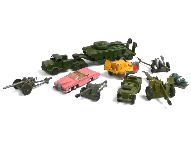 DINKY TOYS (GB) Ensemble d'un camion transport de char, un char, une JEEP & 4 canons