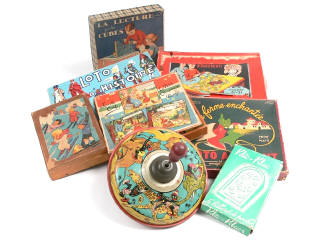 états de 'B' à 'D' - comprend notamment : loto 'HISTOIRE DE FRANCE' 'LA FERME ENCHANTEE', LA LECTURE PAR LES CUBES, une toupie en tôle lithographiée (quelques parties oxydées) & mini billard - avec manques