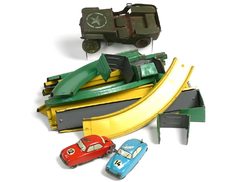 comprend : une JEEP (état 'F') & 2 voitures en tôle lithographiées (de la marque JOUEF) - traces d'humidité & d'oxydation - avec manques