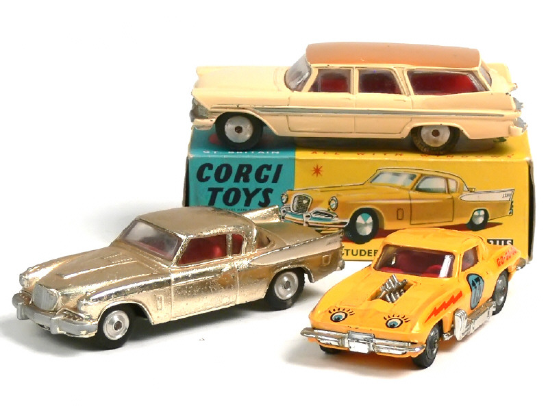 comprend : PLYMOUTH SPORT SUBURAN (en boîte état 'b', avec bulletin d'inscription au club), CHEVROLET CORVETTE STING RAY (quelques manques de pellicule chromée par endroits) & STUDEBAKER GOLDEN HAWK (état 'D', importantes traces d'humidité sur la carrosserie)