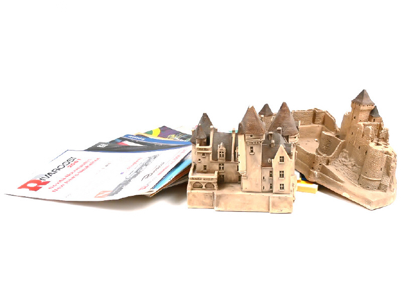 réalisation en plâtre - dimensions : 32 x 23 x 18 cm & 18 x 10 x 18cm - avec maqnues & parties cassées - on y joint un ensemble de 20 catalogues des marques ARNOLD, MINITRIX, TRIX, FLEISCHMANN, RIVAROSSI, LIMA & DINKY TOYS (1971)