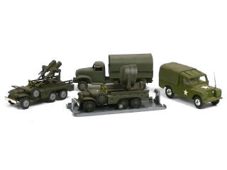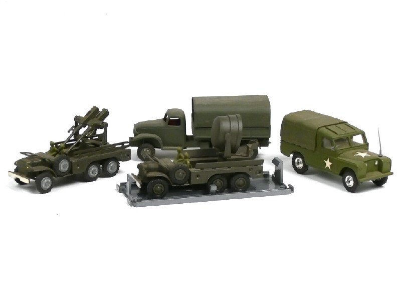 comprend : LAND ROVER bâchée, DODGE 6x6 (2 exemplaires différents dont un avec boîte en état 'b') & GMC bâché 'en état 'R') - on y retrouve les marques : CORGI TOYS & FRANCE JOUETS