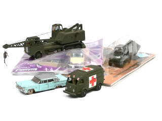 comprend : LINCOLN PREMIERE (état 'E'), RENAULT 1000kg ambualnce militaire (état 'D', carrosserie encrassée), camion-grue 20T 'COLES' (repeint), DODGE 4x4 avec cuisine roulante & ARONDE P60 (vendus en kiosque sous blisters jamais ouverts en état 'A+')
