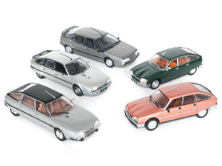 miniatures reproduisant les modèles : GS 1015 1971, GSA CLUB Speciale 1979, CX GTi Turbo série 2 1986, CX PRESTIGE 1978 & XM 1989