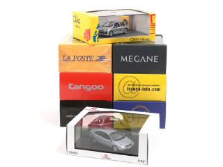 comprend : RENAULT CLIO V6, 1.9 DCI (2 exemplaires différents), KANGOO 1.2 LRC, MEGANE coupé 2.0 L, CITROEN C5, PEUGEOT RC & 404 - une boîte en état 'c'