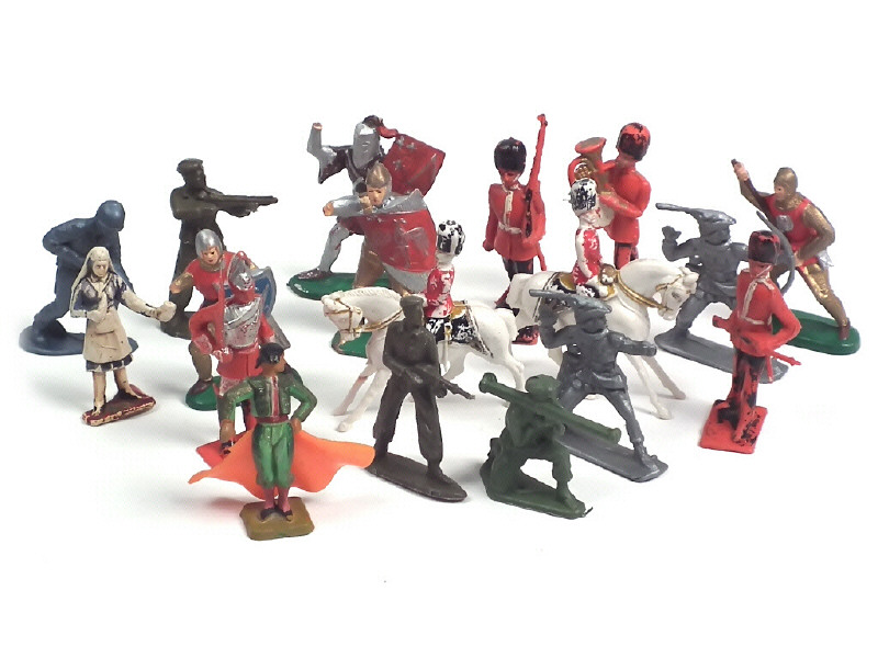 états de 'A' à 'E' - différentes échelles - comprend notamment : torèro, soldats, infirmière, horseguards, chevaliers, figurine assise & pilote de moto - on y retrouve notamment les marques : CLAIRET & CHERILEA TOYS