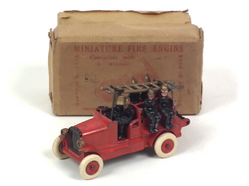 fabrication en plomb de 1934 - avec sa cloche & son échelle à manivelle (un support manquant) - un éclat majeur à l'arrière du véhicule - pneus & ficelle non d'origine - un manque de papier important sur une face de boîte (agrafes oxydées) - BEL ETAT POUR UN MODELE DE CETTE EPOQUE !