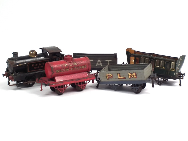 états de 'E' à 'F' - comprend : locomotive à vapeur type 040, un wagon-citerne & 2 wagons-tombereaux - on y joint une voiture de voyageur & un accessoire états 'F'