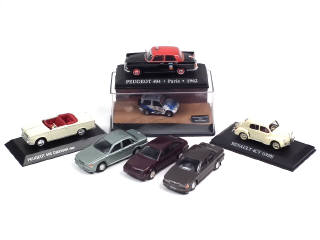 états de 'A' à 'C' - miniatures reproduisant les modèles : PEUGEOT (2 exemplaires différents dont un avec pare-brise manquant), FORD, MITSUBISHI (3 exemplaires différents dont un de petite échelle avec boîte-diorama & socle de présentation) & RENAULT - on y retrouve notamment les marques : TROFEU & HACHETTE