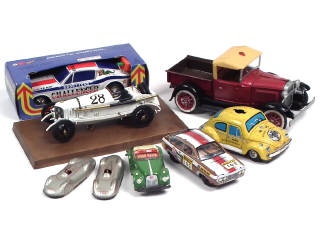 différentes échelles - états de 'B' à 'R' - comprend notamment : VOLKSWAGEN COCCINELLE, RENAULT 15, MG cabriolet, AUTO-UNION (2 exemplaires) & FORD MUSTANG téléguidée (en boîte état 'c', non testée) - on y retrouve notamment les marques : ASAHI MODEL PET, PAYA, WESTERN MODEL (sur socle de présentation en bois, petites pièces cassées à recoller) & HUBLEY