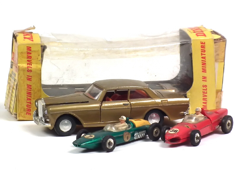 comprend : ROLLS ROYCE SILCER CLOUD (en boîte état 'e'), FERRARI RACING CAR & BRM RACING CAR - petits manques - quelques pneus non conformes - carrosseries encrassées