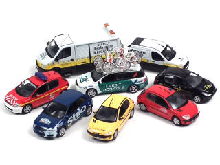 comprend : RENAULT KANGOO 'RENAULT SERVICE', MASCOTT 'RENAULT ASISTANCE', FIAT STYLO, STATION WAGON 'CREDIT AGRICOLE' porte vélos (avec 4 vélos & 4 roues de rechange), PEUGEOT 206 'FRANCE INFO', 'LA POSTE', 'INCENDIES SECOURS' & 307 'SAPEURS POMPIERS'