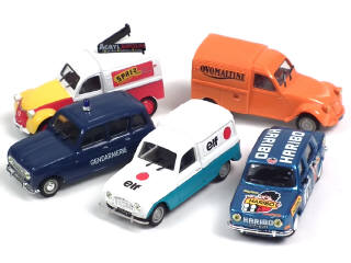comprend : SIMCA 1000 'HARIBO', RENAULT R4 'GENDARMERIE', fourgonnette R4 'ELF', CITROEN 2CV fourgonnette 'OVOMALTINE' & 'ACRYL RIPOLIN'