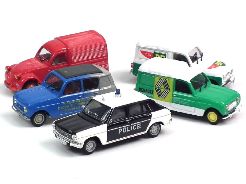comprend : SIMCA 1100 'POLICE' (antenne cassée), CITROEN 2CV camionnette 'ALLO ...18', RENAULT fourgonnette R4 'RENAULT MOTOCULTURE', 'AIR BP' & RENAULT R3 '9ème SALON DES JEUX 1994'