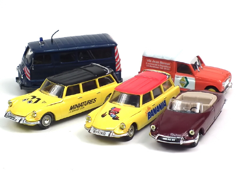comprend : CITROEN ID19 break 'BANANIA', 'MINIATURES', DS19 cabriolet, RENAULT fourgonnette R4 'RENAULT MOTOCULTURE' & ESTAFETTE 'GENDARMERIE'