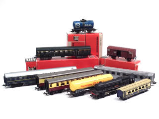 états de 'B' à 'E' comprend : voiture de première classe (avec boîte en état 'b'), wagon-tombereau UIC (boîte en état 'b'), couvert ( boîte en état 'c'), wagon-fourgon PV (boîte en état 'b'), 3 voitures de voyageurs de 2ème classe, 2 wagons-citerne 'AZUR' & une voiture de voyageurs de la CIWL (fabrication en tôle) - on y joint 2 voitures de voyageurs de la marque TRI-ANG, une locomotive type 231 'PRINCESS VICTORIA', 3 voitures de voyageurs (une de la CIWL & 2 'LE MISTRAL) & 3 wagons de marchandises de la marque LIMA - quelques traces d'oxydation & petits manques