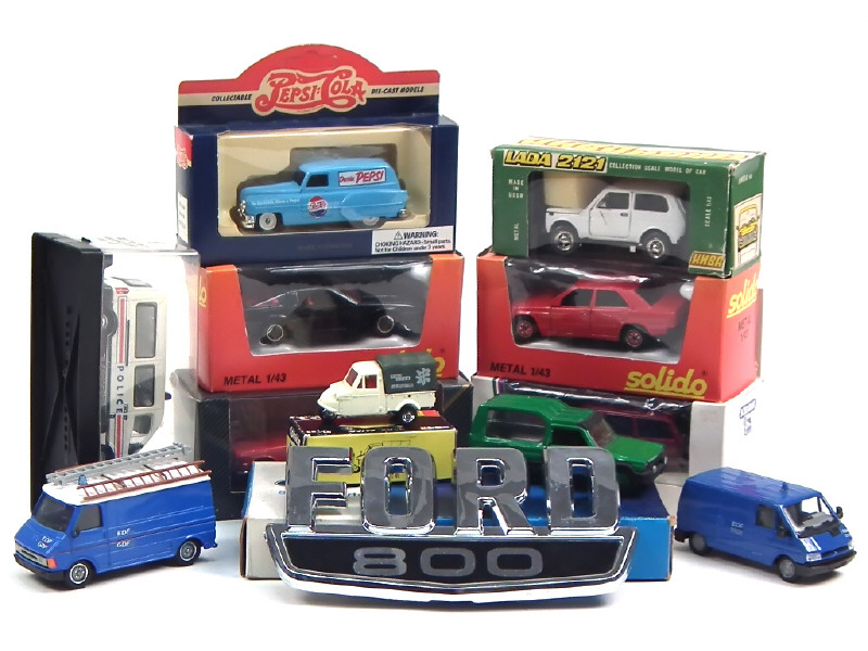 miniatures reproduisant les modèles : BMW, CHEVROLET (boîte en état 'c'), MERCEDES, VOLKSWAGEN, PONTIAC, LADA (boîte en état 'c'), MATRA SIMCA, CITROEN, RENAULT (2 exemplaires différents) & DAIHATSU - 3 modèles sans boîte - on y joint un sigle de calandre 'FORD 800' avec sachet d'accessoires en état 'A,c'