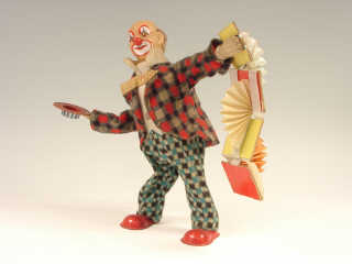 référence 52B du livre de BRIAN MORAN 'BATTERY TOYS' - hauteur 27 cm - en action le clown se balance de droite à gauche tout en remettant son chapeau sur la tête - il fait apparaître & disparaître des éventails tandis que son nez s'allume - mécanismes à revoir - in action, the clown rocks from side to side putting his hat back on his head - he makes fans appear & disappear & his nose lights up - mechanism subject to verification