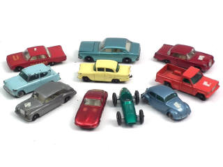 petites échelles - états de 'B' à 'E' - miniatures reproduisant les modèles : VAUXHALL, FORD (3 exemplaires différents), JAGUAR, VOLKSWAGEN, ASTON MARTIN, JEEP, MERCEDES & ROLLS ROYCE - petits manques - quelques traces d'étiquettes autocollantes par endroits