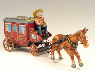 longueur 39 cm - en action la diligence avance en émettant le bruit des sabots du cheval - mécanismes fonctionnent - légère oxydation du boîtier des piles - in action, the stagecoach moves forwards with horseshoe sound effects - in working condition - slight rusting in the battery cage