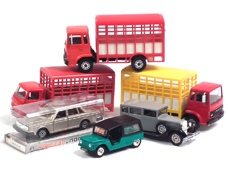 comprend : RENAULT, SAVIEM, DAF camions-bétaillères, CITROEN MEHARI (une partie de carrosserie déformée), FIAT 525 (carrosserie très légèrement déformée) & VOLVO 264 (en boîte état 'c') - quelques petits détails de peinture ajoutés