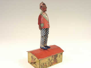 hauteur 25 cm - mécanisme à ressort (fonctionne) - en action le personnage sautille sur le toit de la maison - en tôle lithographiée - fabrication vers 1920