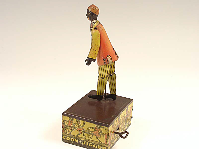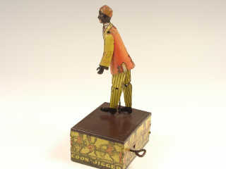 hauteur 20 cm - mécanisme à ressort (fonctionne) - en action le personnage danse sur une scène en tournant sur lui-même - en tôle lithographiée - petites traces d'oxydation - fabrication vers 1920