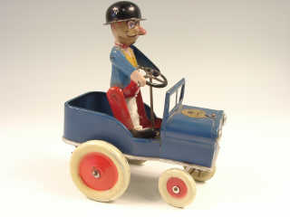 longueur 20 cm - moteur à ressort (fonctionne) - en action le véhicule avance & recule dans toutes les directions tandis que le personnage est secoué d'avant en arrière - bandes de roulement des roues repeintes - décalque arrière effacé
