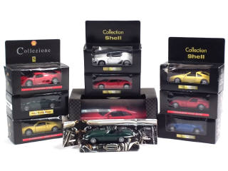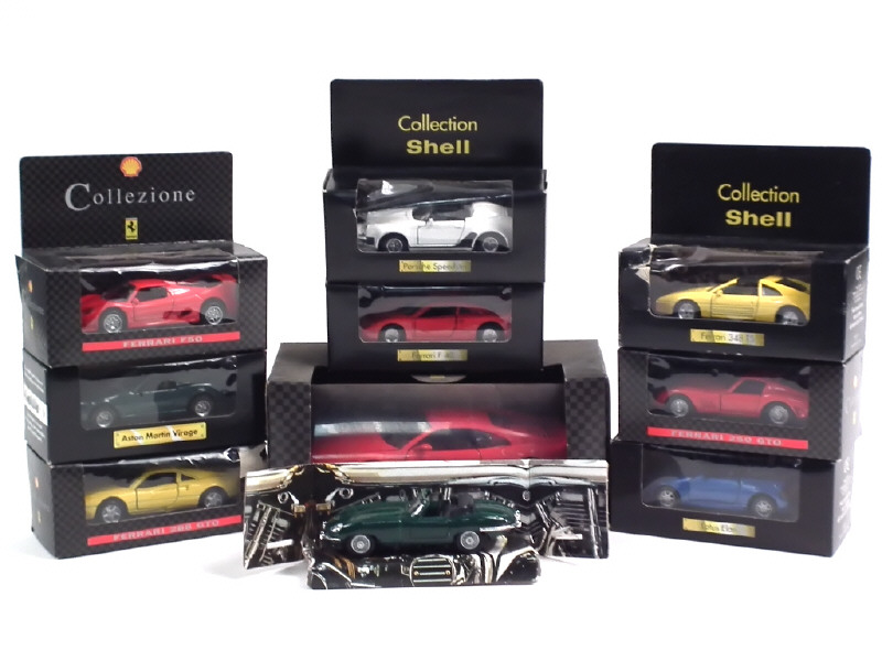 COLLECTION SHELL - comprend : PORSCHE SPEEDSTER, LOTUS ELAN, FERRARI F40, 348 TS, F50, 288 GTO, 250 GTO, F355 (grande échelle), JAGUAR TYPE E & ASTON VIRAGE - 2 boîtes en état 'd' & une en état 'c'