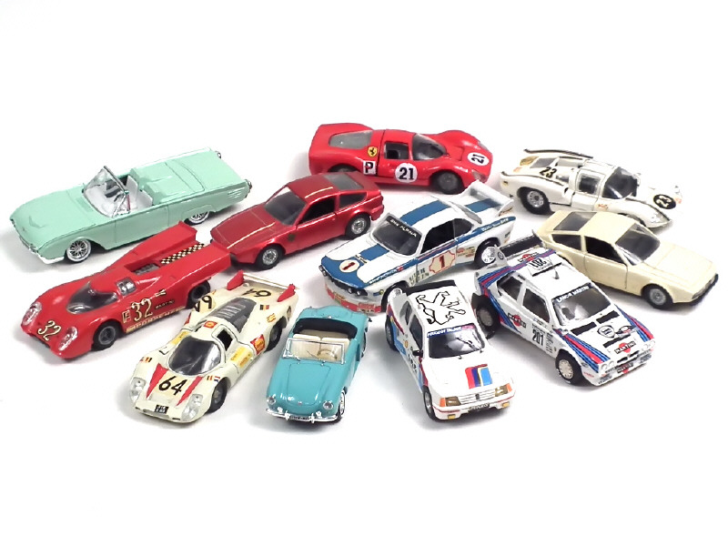 états de 'A' à 'D' - miniatures reproduisant les modèles : ALFA (2 exemplaires différents), ROMEO, FORD, PEUGEOT, PORSCHE (2 exemplaires différents), BMW, BRISSONNEAU & LOTZ, FERRARI & CHAPPARAL - on y retrouve notamment les marques : C.E.C., SOLIDO & PROVENCE MOULAGE - trace de peinture blanche sur 9 planchers