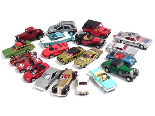 états de 'A' à 'D' - miniatures reproduisant les modèles : RENAULT, FORD (4 exemplaires différents), MERCEDES (3 exemplaires différents), MERCURY (2 exemplaires différents), MG, PORSCHE, BUGATTI, PLYMOUTH, ALFA ROMEO, CHEVROLET, LANCIA, AUBURN, FERRARI & GREMLIN - on y retrouve notamment les marques : MAISTO, MATCHBOX, NEW RAY, SABLON, YATMING, ROAD SIGNATURE, INTER-CARS, SOLIDO, JOAL, CORGI TOYS, BRUMM & POLISTIL - trace de peinture blanche sur 17 planchers