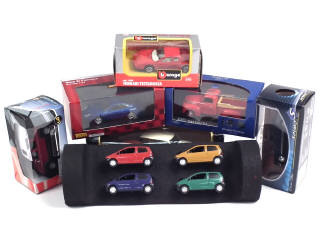 comprend : RENAULT TWINGO (4 exemplaires différents regroupés dans un coffret - manque étui & blister décollé), PEUGEOT 403, LAND ROVER NEW DISCOVERY, FORD F1 1948, FERRARI TESTA ROSSA (boîte en état 'c'), PORSCHE 911 CARRERA & RANGE ROVER (boîte en état 'c') - on y retrouve les marques : SOLIDO, HONGWELL, MINICHAMPS, BBURAGO, TAUXI CARS & VEREM