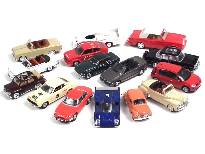miniatures reproduisant notamment les modèles : PANHARD (2 exemplaires), PEUGEOT (2 exemplaires), SIMCA, RENAULT (4 exemplaires), TRIUMPH, BENTLEY, ALFA ROMEO, TOYOTA, PORSCHE (manque rétroviseur) & FERRARI
