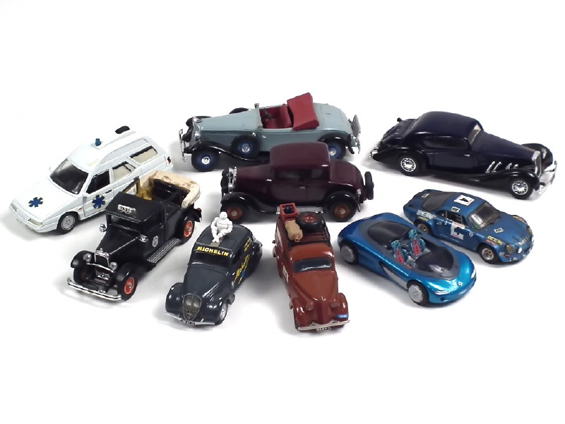 états de 'A' à 'R' - comprend : RENAULT JUVA QUATRE 'FELIX POTIN', REINASTELLA, LAGUNA, ALPINE RENAULT 1600, DELAGE V8, PEUGEOT 202 'MICHELIN', CITROEN XSARA ambulance & C4F (2 exemplaires différents dont un modifié) - on y retrouve notamment les marques : ELYSEE, M.R.F, PARADE CAR, MINIROUTE & SOLIDO - quelques petites pièces à recoller