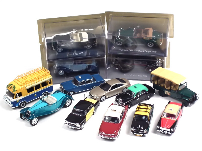 modèles vendus en kiosque - miniatures reproduisant notamment les modèles : RENAULT (2 exemplaires) , BUCCIALI, LANGONDA, CORD, BUGATTI, HOLDEN, CITROEN, VOLGA, BMW, PEUGEOT, HINDUSTAN, TATRA, SEAT, HOTCHKISS & TOYOTA (en état 'B' avec quelques rambardes cassées) - 4 modèles sous blister dont un déchiré - avec manques & petites pièces à recoller