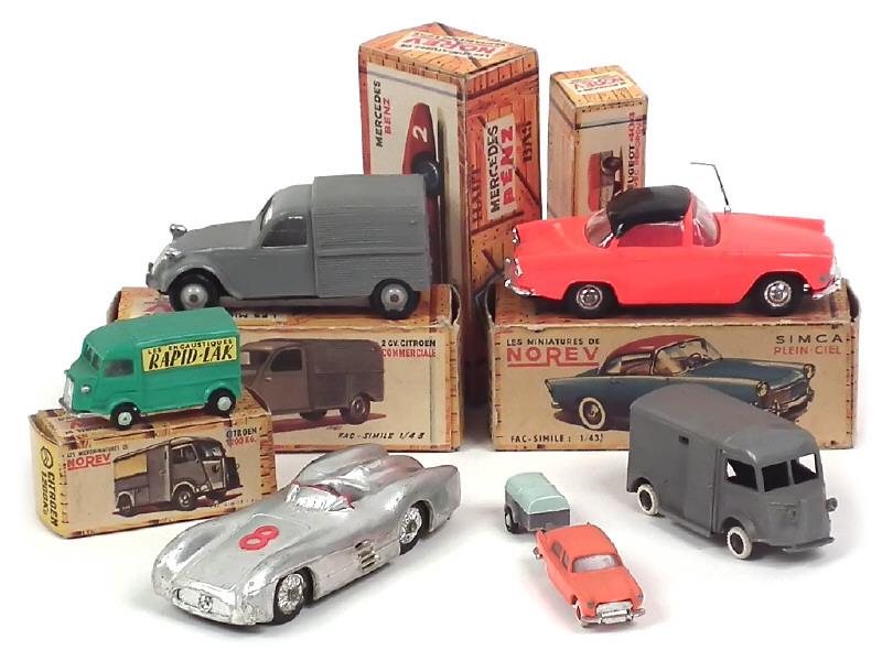 comprend : SIMCA PLEIN CIEL (état 'B.c', antenne & carrosserie très légèrement déformées), CITROEN 2CV commerciale (état 'B.c', carrosserie légèrement déformée), CITROEN 1200kg 'RAPID-LAK' (état 'B.b', série MICRO, carrosserie légèrement déformée), MERCEDES de compétition (état 'D.b') & PEUGEOT 404 avec remorque (état 'B.c', série MICRO, carrosserie légèrement déformée & encrassée) - on y joint un CITROEN 1200kg de la marque CLE (état 'A')
