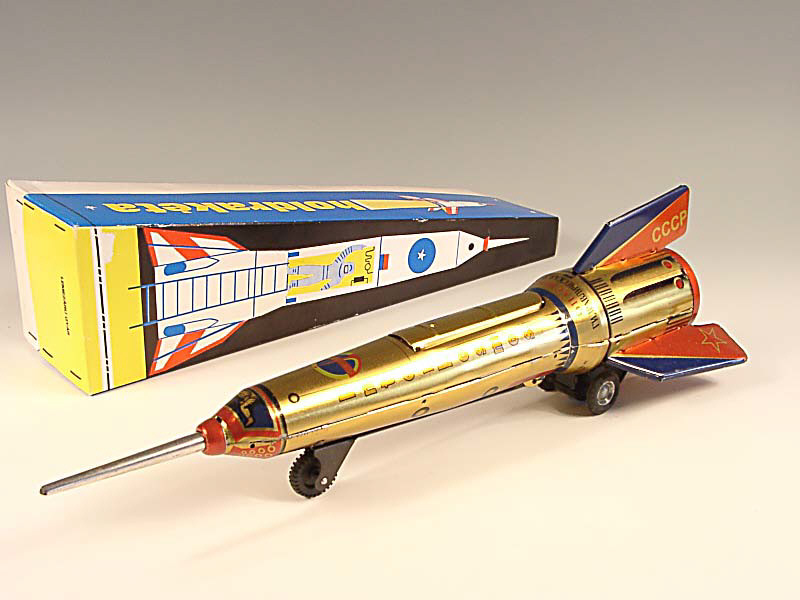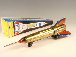 hauteur 40 cm - moteur à friction (fonctionne) - en action, la fusée avance & se redresse lorsqu'elle heurte un obstacle - l'ouverture d' un sas permet de déplier une échelle & d'entrevoir le cosmonaute