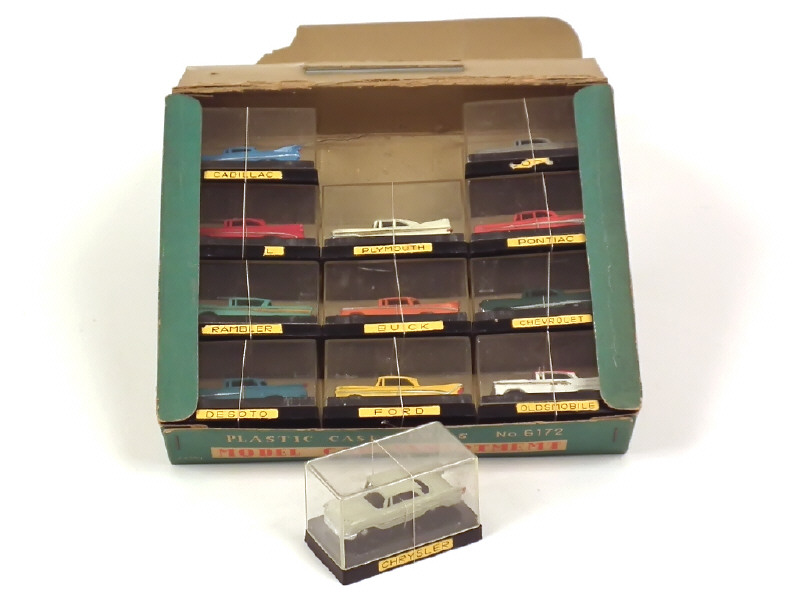 échelle HO - contient : CADILLAC, OLDSMOBIL (état 'D'), RAMBLER, DOSOTO, CHRYSLER (état 'B'), PLYMOUTH, BUICK (état 'B'), FORD, CHEVROLET (état 'B'), DODGE, PONTIAC (état 'B') & IMPERIAL - en boîtes-vitrines individuelles (quelques petites fêlures) - manque 2 papiers de désignation de socle