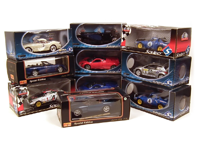 échelle 1/18ème - comprend : PAGANI ZONDA C12 (2 exemplaires différents), JAGUAR XKR, XK8, PEUGEOT 206WRC, LANCIA STRATOS (3 exemplaires), BUGATTI ROYALE & CHEVROLET CORVETTE - on y retrouve les marques : MAISTO & SOLIDO