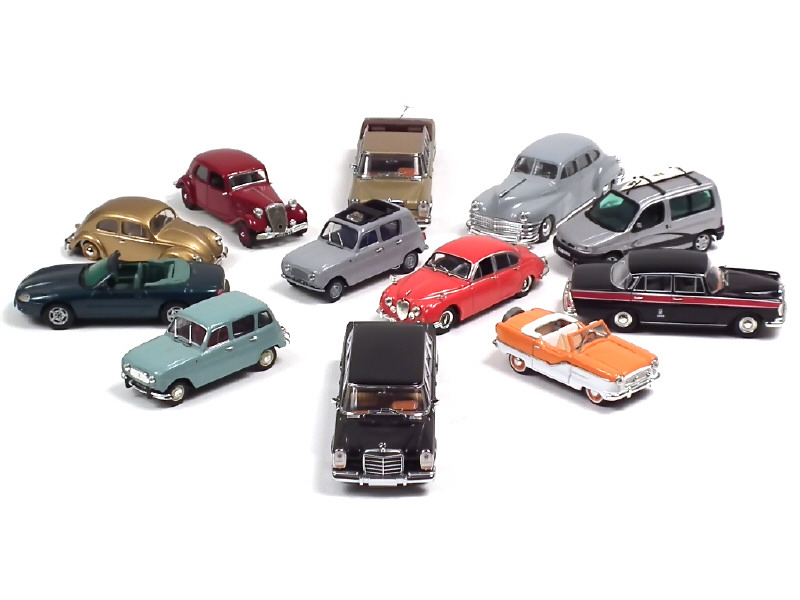 miniatures reproduisant les modèles : CHEVROLET, CHRYSLER, CITROEN, JAGUAR (2 exemplaires différents), LANCIA, MERCEDES (3 exemplaires), NASH, PEUGEOT, RENAULT (2 exemplaires), MINI & VOLKSWAGEN - quelques petits manques