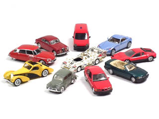 miniatures reproduisant les modèles : ALFA ROMEO, BUGATTI, BMW (2 exemplaires différents dont une en état 'D'), CITROEN, FERRARI (en état 'D'), LANCIA, PORSCHE & RENAULT (2 exemplaires) - quelques petits manques