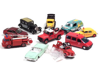 miniatures reproduisant les modèles : CITROEN, FORD (2 exemplaires différents), HOTCHKISS, LANCIA, LAND ROVER, PEUGEOT, SAVIEM, RANGE ROVER & RENAULT- quelques petits manques
