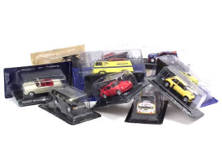 modèles vendus en kiosque - miniatures reproduisant les modèles : RENAULT (2 exemplaires différents), PEUGEOT (3 exemplaires différents), SAAB, AUDI, PORSCHE & CITROEN (2 exemplaires différents dont une boîte en état 'c')