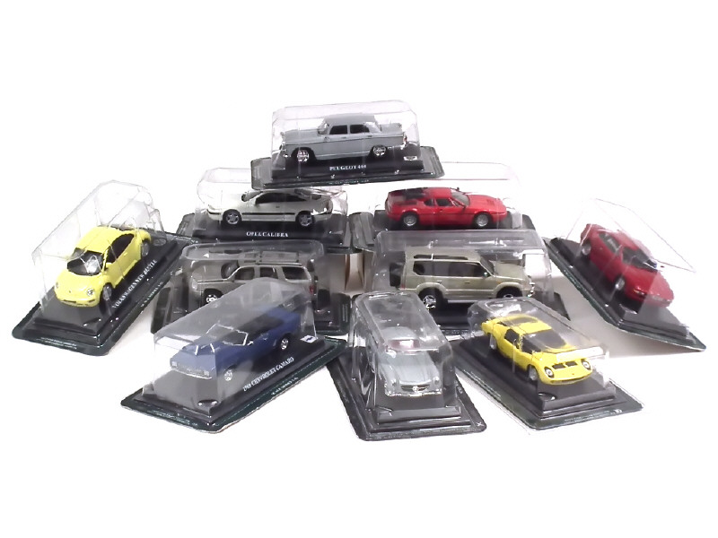 modèles vendus en kiosque - miniatures reproduisant les modèles : TOYOTA, CHEVROLET, BMW, OPEL (blister déformé), BMW, MERCEDES, CADILLAC, VOLKSWAGEN, PEUGEOT (blister déchiré) & LAMBORGHINI (blister légèrement déformé)