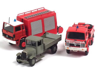 comprend : 2 RENAULT camions de pompiers (dont un en métal) & un camion benne - avec manques & parties cassées