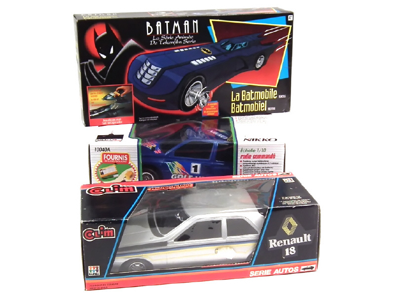 échelle 1/18ème - comprend : voiture de BATMAN avec mini jet (longueur 42 cm), GOLF VRS radiocommandée (échelle 1/10ème - non testé) & RENAULT FUEGO GTX 2000 (longueur 35 cm en état 'B' - moteur à piles non testé - manque antenne - boîte avec mention RENAULT 18) - on y retrouve les marques : KENNER, NIKKO & BARVAL