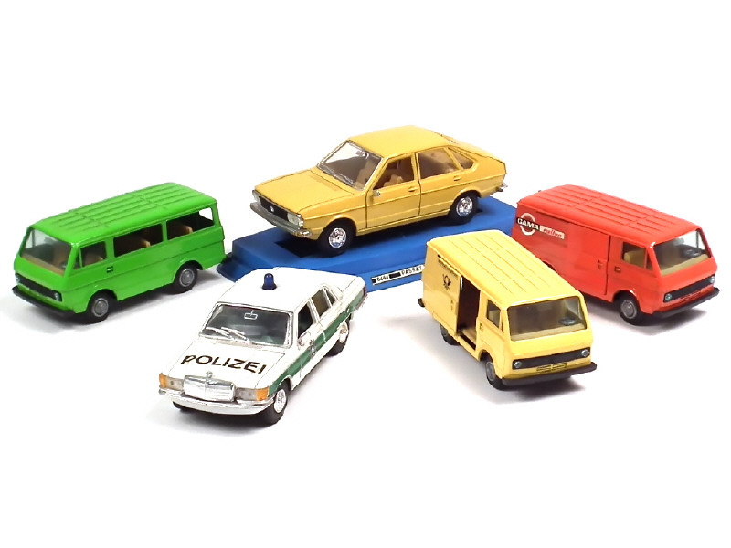 comprend : VOLKSWAGEN PASSAT TS (échelle 1/24ème - avec boîte en état 'b'), MERCEDES 450 SE 'POLIZEI' (échelle 1/24ème - carrosserie encrassée) & VOLKSWAGEN LT35 (3 exemplaires différents à l'échelle 1/35ème)