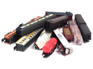 états de 'B' à 'E' - comprend : une voiture de voyageurs, un wagon de bagages & un de marchandises - on y joint 3 voitures de voyageurs, un wagon postal & un wagon-tombereau de la marque LIMA & ROCCO - avec manques, parties cassées & traces d'oxydation