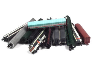 états de 'B' à 'E' - comprend : 4 voitures de voyageurs, un wagon postal, de marchandises & transport d'autos - on y joint une motrice électrique (non motorisée) & 3 voitures de voyageurs de la marque LIMA - avec manques, parties cassées & traces d'oxydation
