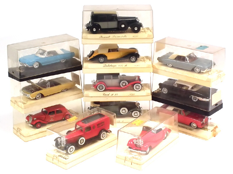 miniatures reproduisant les modèles : CADILLAC (3 exemplaires différents), DELAHAYE, RENAULT, FORD (3 exemplaires différents), CITROEN, CORD, MERCEDES & BENTLEY - 11 modèles de la collection 'AGE D'OR' & un de la collection 'HI-FI 43' - boîtes & socles jaunis & tachés